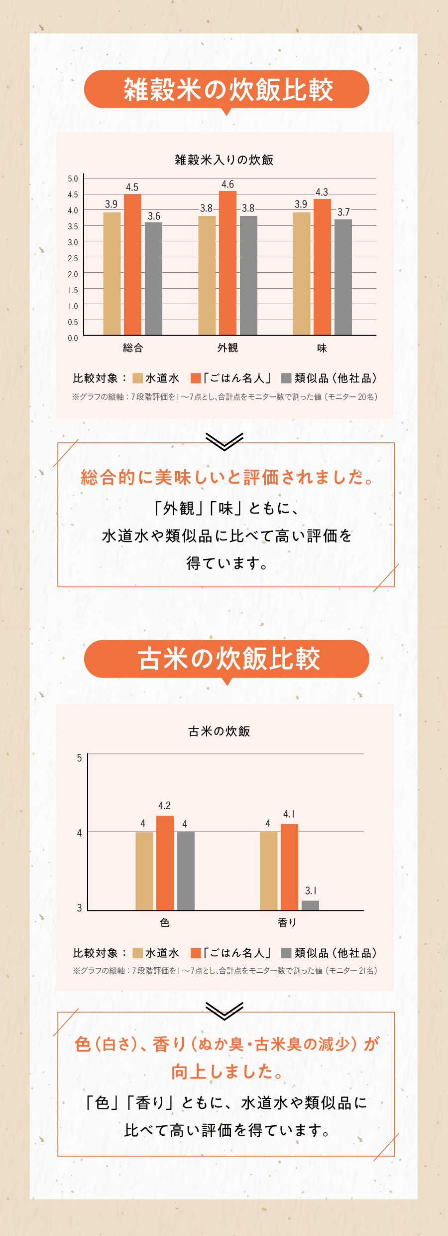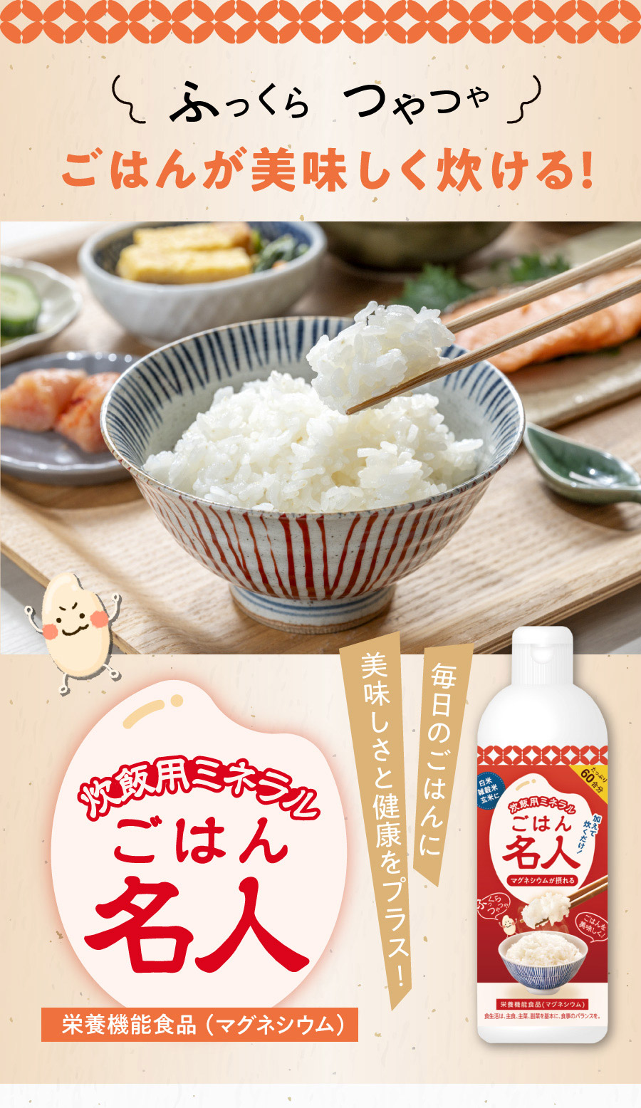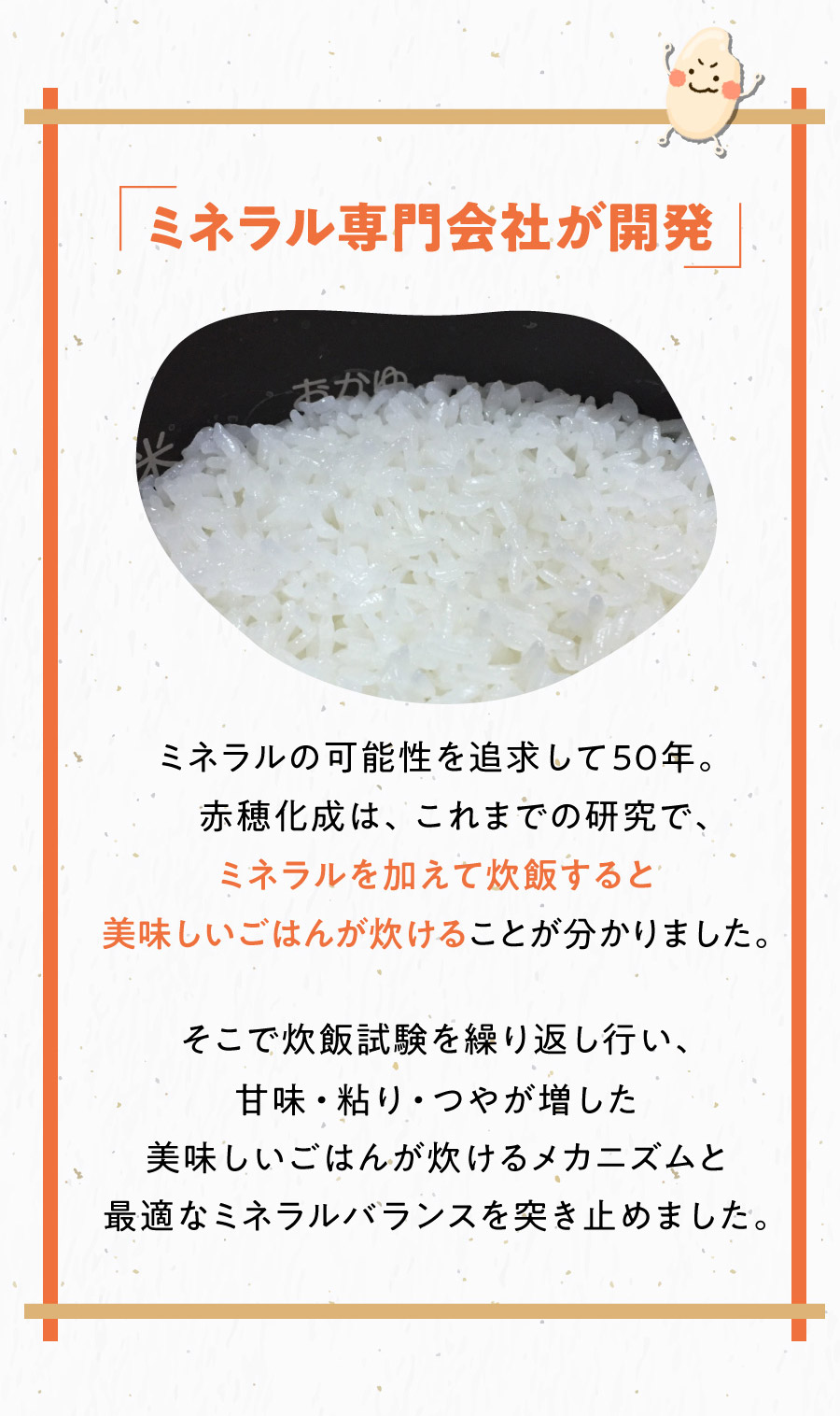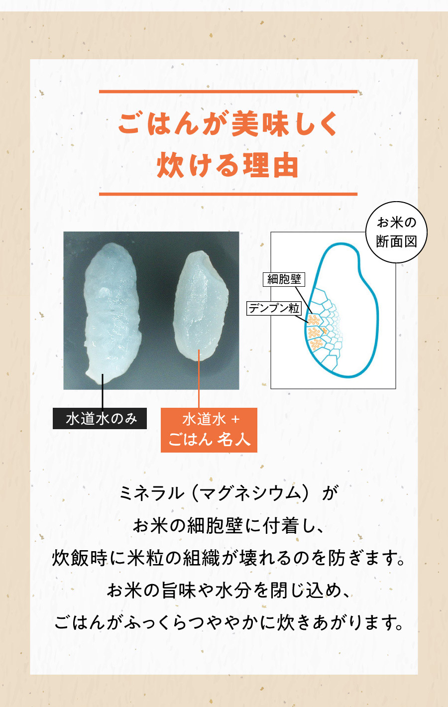 ミネラルで美味しいごはんが炊けることを突き止め、最適なミネラルバランス(マグネシウムとナトリウム)に仕上げました。健康と美味しさの両方を叶えます。