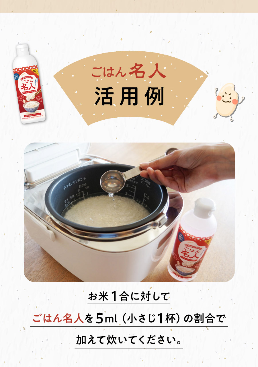 お米1合に対して本品5ml(小さじ1杯)の割合で加えて炊いてください。