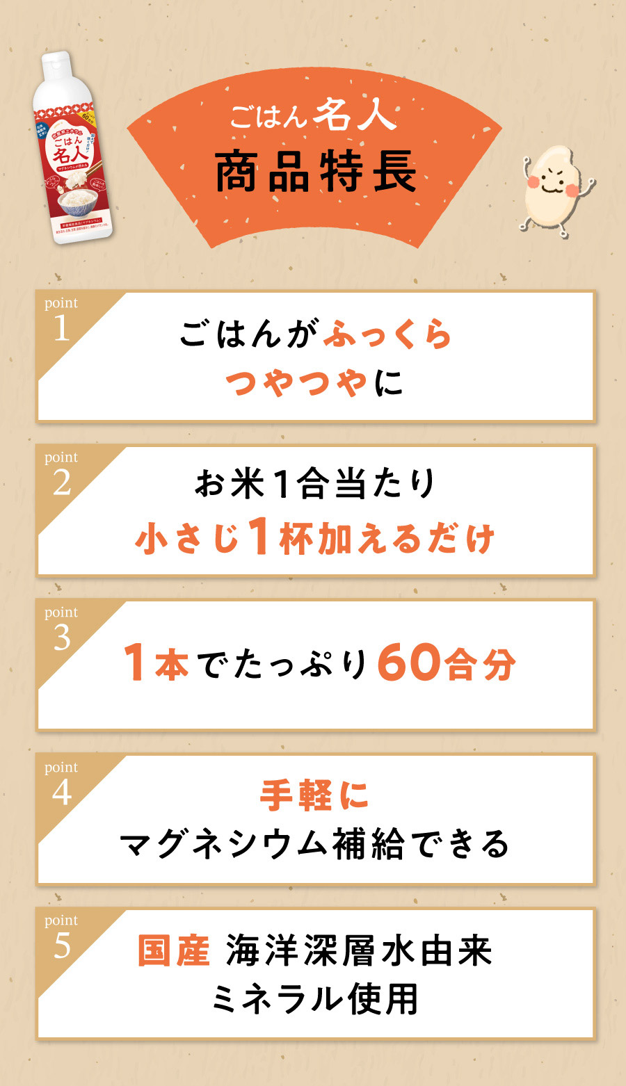ごはん名人 300ml」はクリーンな室戸海洋深層水由来ミネラルを100%使用した炊飯用ミネラルです。