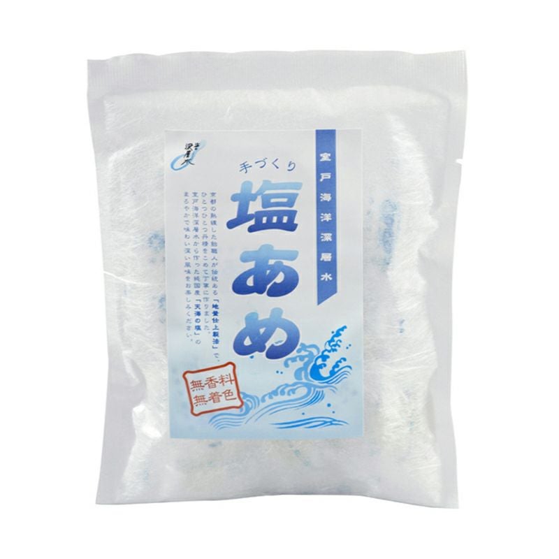京都には、たくさんの風雅で奥深い文化があります。食文化に関しても昔から日本料理や和菓子(飴)の本場としても知られています。その京都の飴職人が海洋深層水の塩を使い、手作りでひとつひとつ丁寧に仕上げました。また、安心してお召し上がりいただけれるよう、香料、着色料、保存料は一切使用しておりません。塩飴のまろやかでやさしい甘さをお楽しみください。