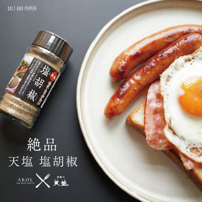 独自の技術でお塩のまわりに胡椒をコーティングして、ひとつの粒にしました。にんにくとしょうがで味を調え、うまみ調味料(アミノ酸)を使用していません。