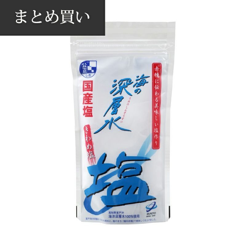 世界の深海を循環し、長い歳月を経て高知県室戸岬沖2,200m、深さ344mから汲み上げた海洋深層水から採ったクリーンでにがり成分を含んだ塩です。 含まれるミネラル成分が、滋味深い豊かな味を作り出しお料理の味をいっそう深めます。