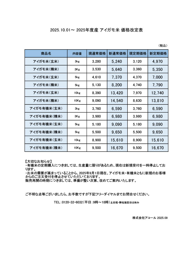 このたび、原材料費や資材費の高騰に伴い、誠に心苦しいのですが、2025年度産のアイガモ米の価格を改定させていただくこととなりました。